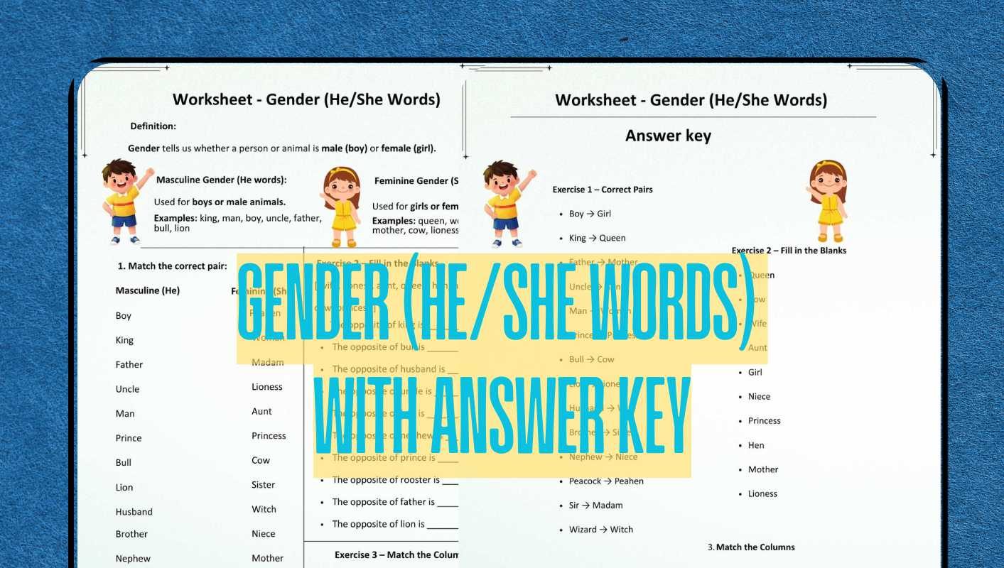 This worksheet introduces learners to the concept of masculine and feminine gender using clear explanations and practical examples. Through engaging activities like matching pairs, fill in the blanks, and column matching, learners can easily understand and practice gender words.