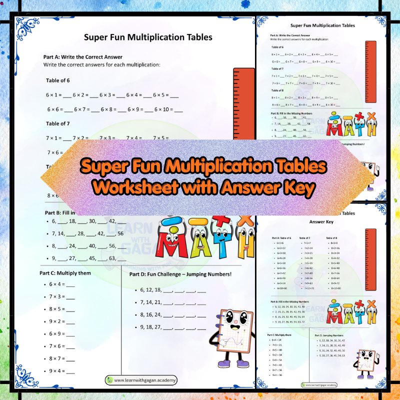Super Fun Multiplication Tables Worksheet with Answer Key (Tables 6, 7, 8 & 9 Practice)